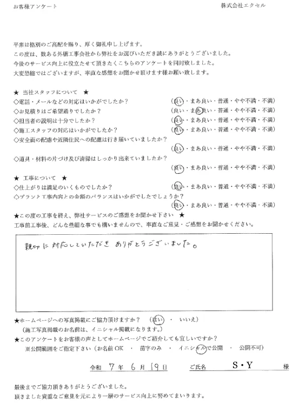 エクセルではお庭の完成度や工事の質だけでなくサービスやお客様満足度の向上のためにも、工事のご縁を頂いたお客様にアンケート用紙へのご記入をご協力いただいております。